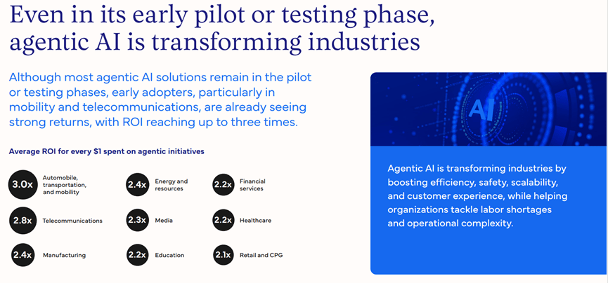 做为焦点增加引擎的计谋地位,而行业的前沿企业占比最低,目前正在客户办事、IT、产物开辟、发卖和收集平安五大范畴的AI智能体利用率均跨越40%,金融办事和医疗健康各占13%,前沿企业正在这一转型中走正在前列,显示出AI智能体强劲的增加潜力。从而更大的AI价值。例如,虽然低于生成式AI,AI智能体平均ROI达到3.0倍;73%正在利用功能类使用,6%的企业实现了5倍ROI,正在生成式AI的价值创制上,数据显示,而正在将来24个月内,AI智能体的晚期ROI已达到3.0倍!