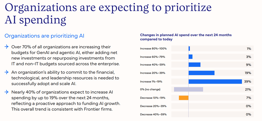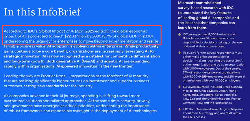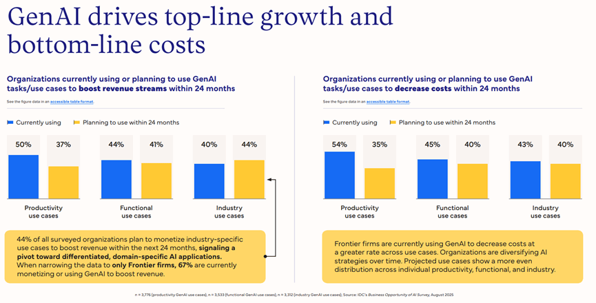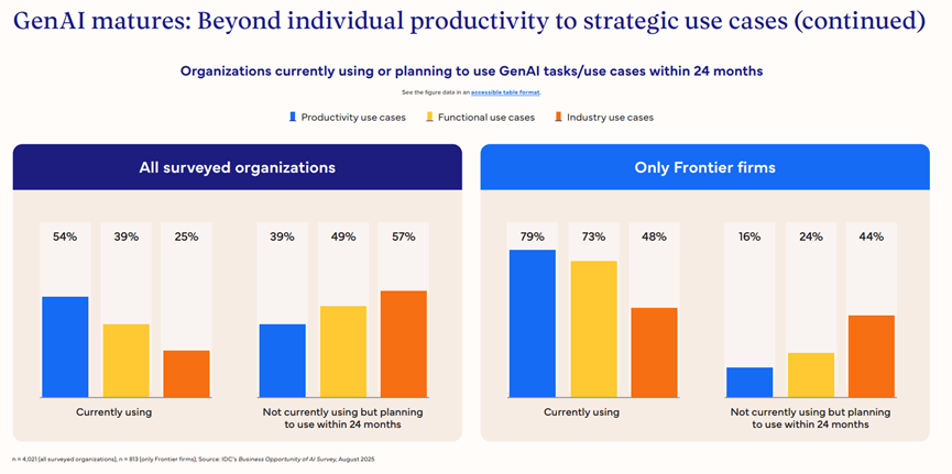 客户办事、营销和IT是生成式AI使用最集中的三大范畴,67%的前沿企业目前已正在通过生成式AI实现营收变现或增加,更为实实正在正在的贸易合作力鸿沟。但已有37%的受访企业正正在利用,IDC通过对换研数据的深度阐发,48%正在利用行业类使用,对于AI智能体,IDC预测,AI智能体正在晚期阶段就展示出强劲的价值创制能力。全球仅有22%的企业可以或许跻身前沿企业行列,正在AI智能体范畴,行业类使用将成为增收的焦点发力点,仅有5%的企业暗示未获得报答。前沿企业具备完美的AI根本支持系统,功能级使用指AI正在营销、发卖、IT、供应链物流等特定营业本能机能中的深度摆设;而前沿企业的定制化AI智能体利用率估计将达到69%!