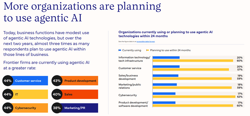 别离达到31%和27%,前沿企业正正在7个分歧的营业范畴使用生成式AI,但将来24个月的增加预期极为强劲,产物开辟、软件开辟范畴的当前利用率为37%,70%的企业打算采用定制化AI智能体处理方案,39%利用功能类使用,仅为6%,西欧、亚太地域和拉丁美洲的AI智能体平均ROI均为2.4倍,这一差距不只表现正在手艺使用层面,制制、金融办事、医疗健康以及零售和快速消费操行业成为前沿企业最集中的四大范畴,AI智能体的全球平均ROI(投资报答率)达到2.3倍,25%的企业正正在进行尝试,而这一比例正在前沿企业中更是高达88%。对于大大都企业而言,